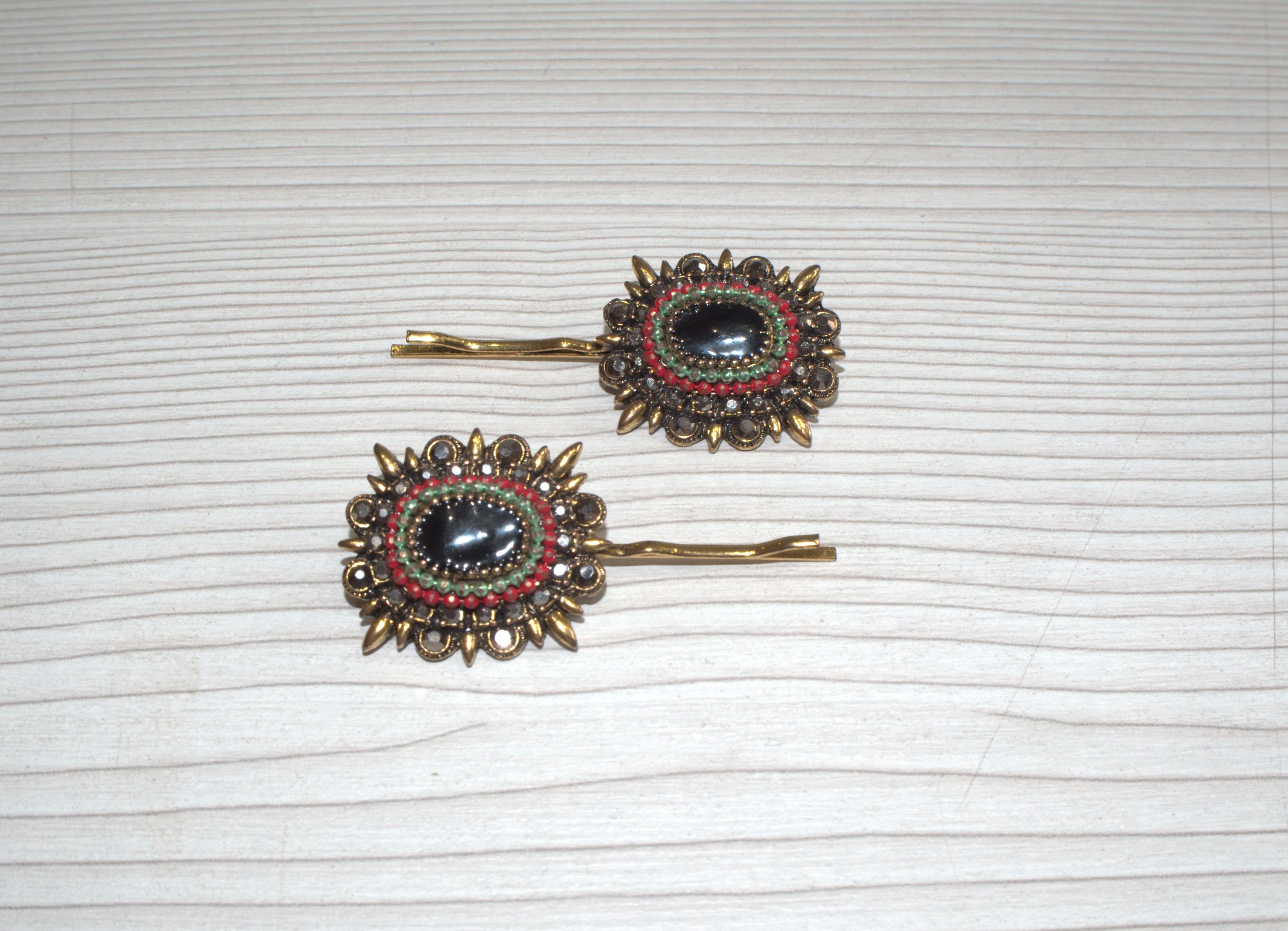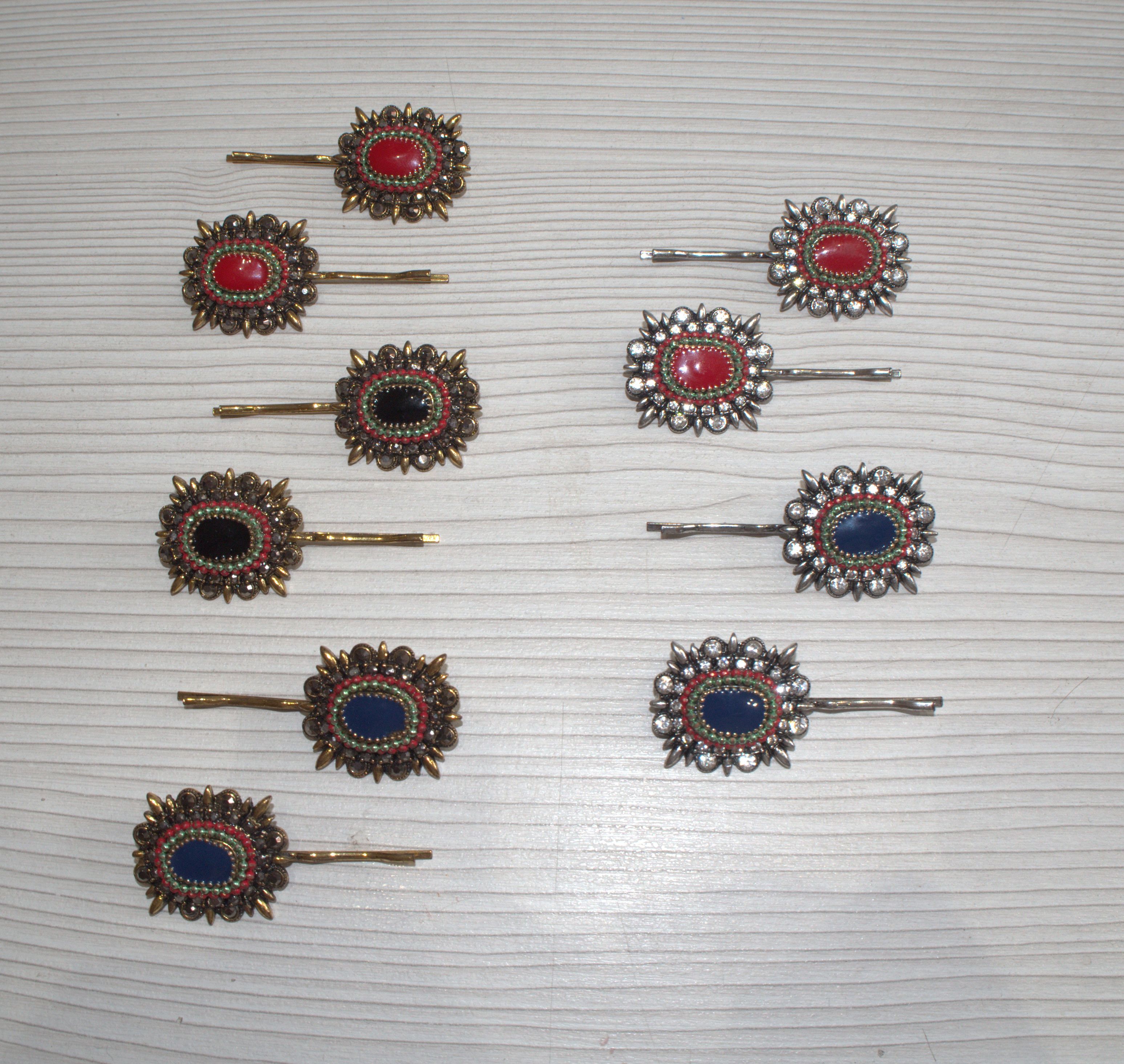 Horquilla plateada/dorada envejecida, con rosetón de abalorios de colores.