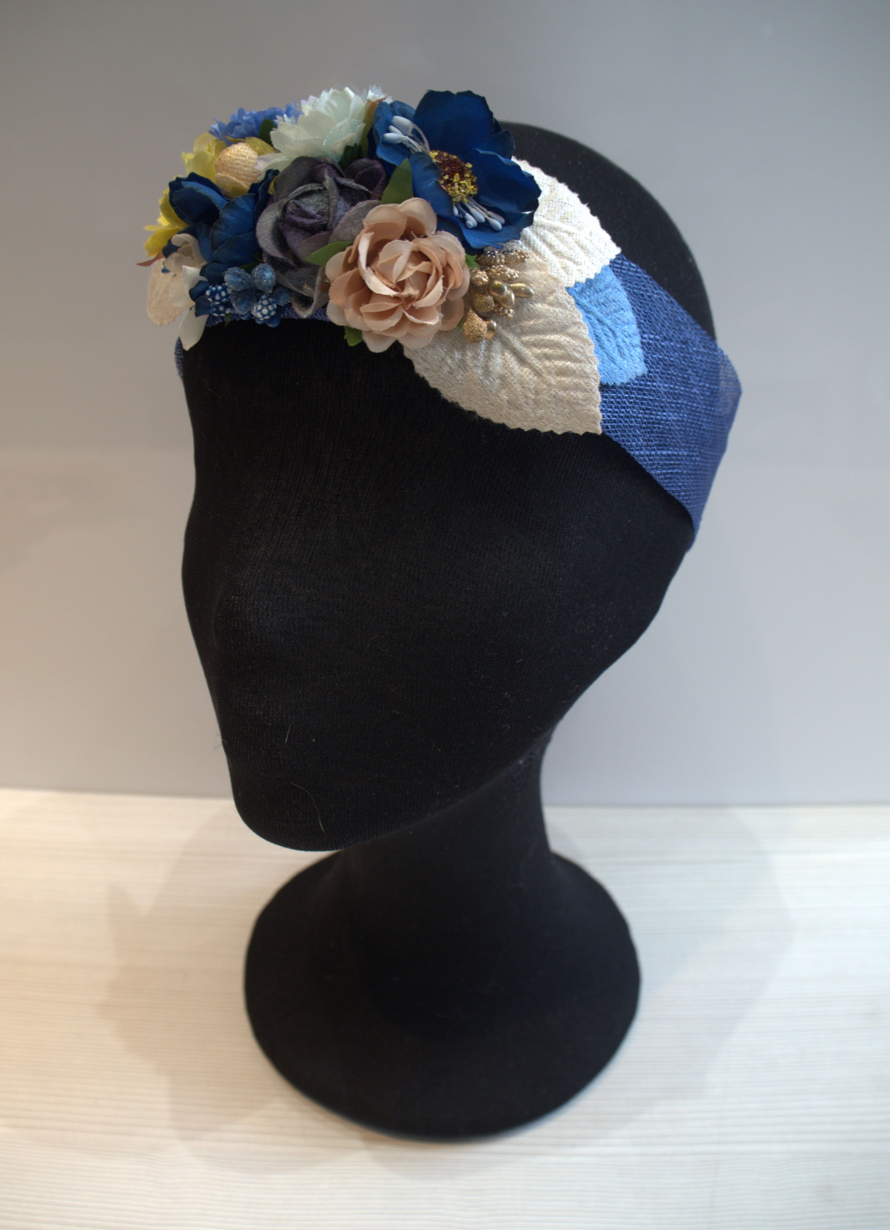 Turbante de sinamay con adorno floral en tonos azules.