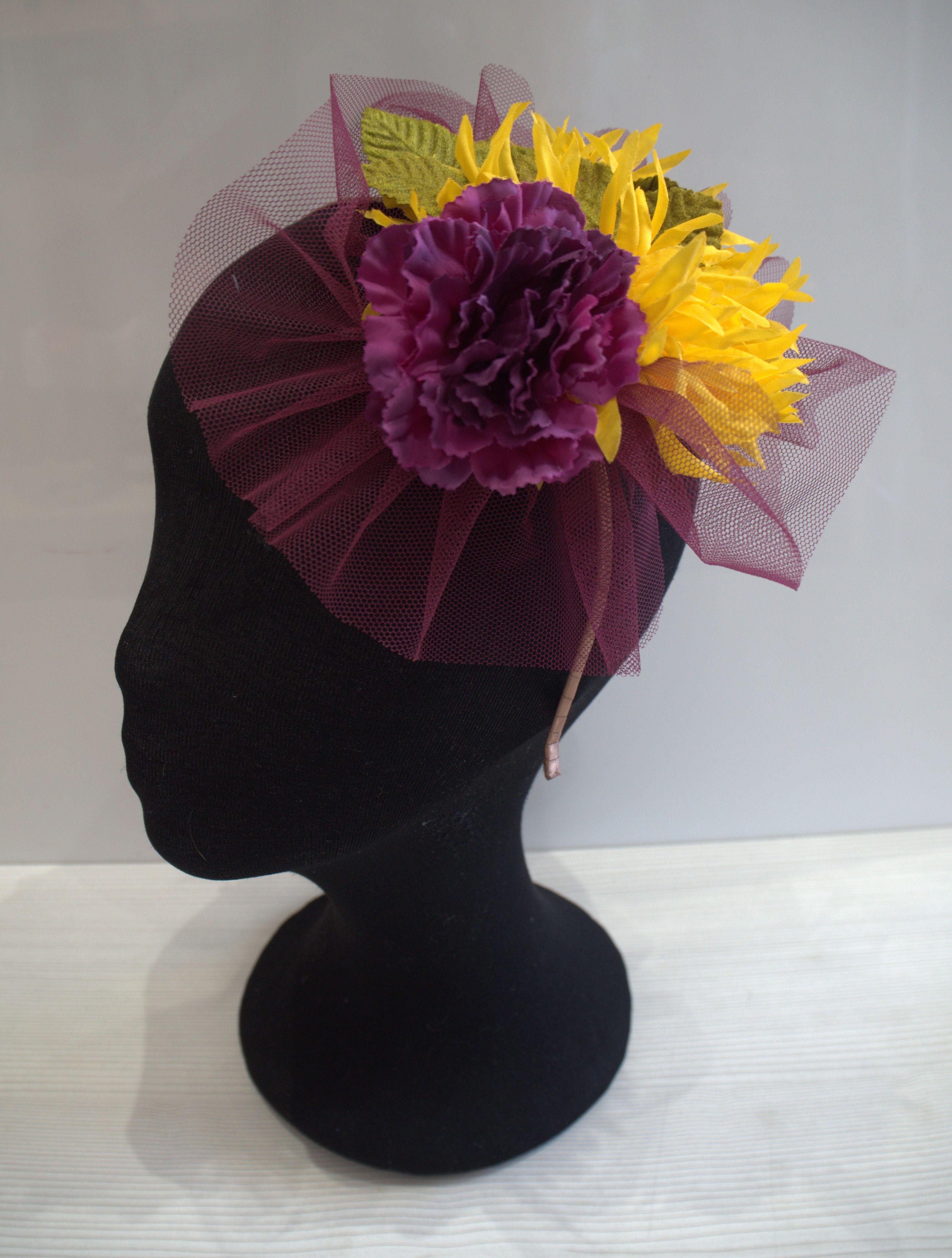 Tocado montado en diadema con tull en buganvilla y una preciosa combinación de tonos amarillo y verde.